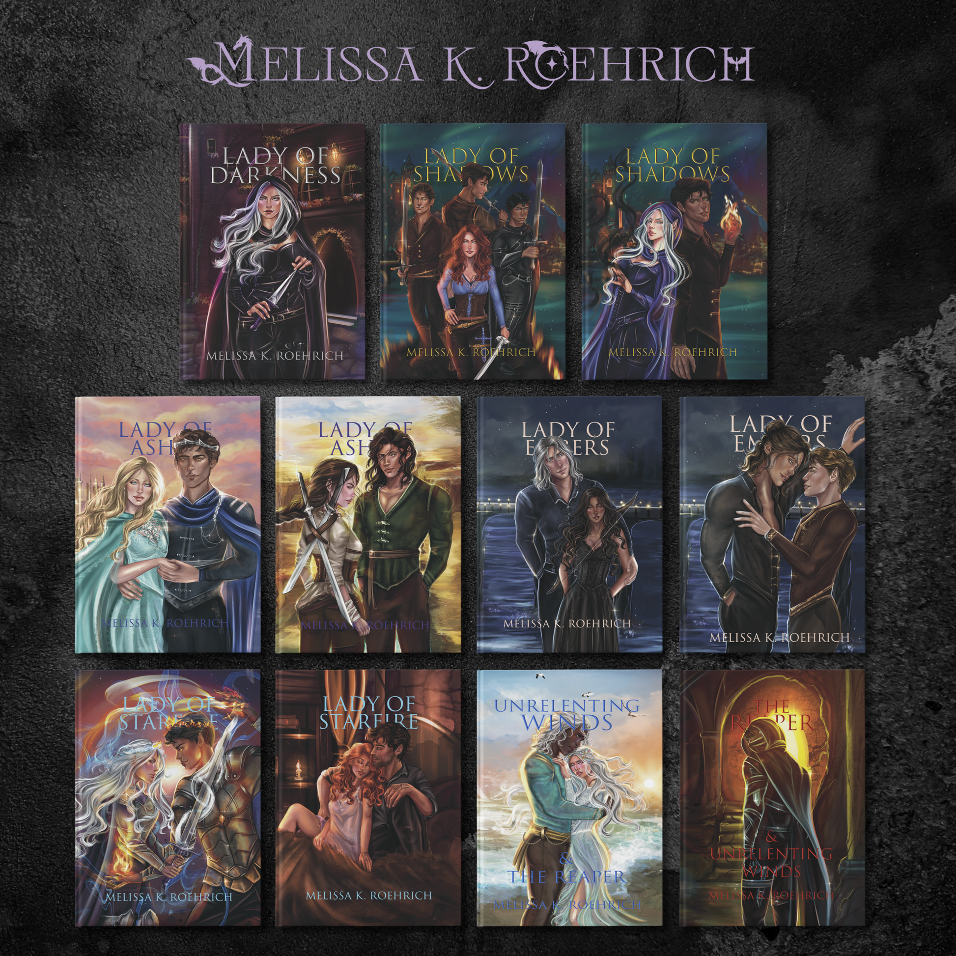 Shadows, Ashes, Embers, Starfire and the combined Reaper/Unrelenting Winds novella have TWO OPTIONS to choose from to complete the set. This does not include both options shown in listing; you must select which art cover you'd like. Keep going through pictures to see full mockups of front/back of the books.